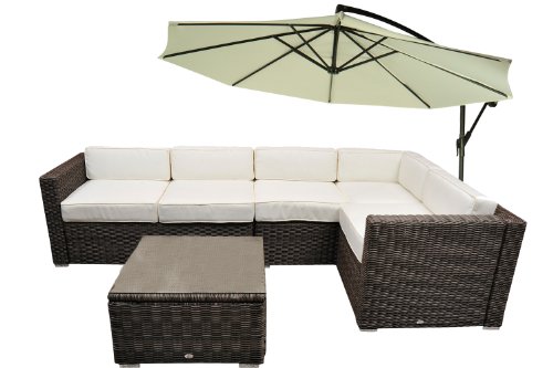Decorating with designer outdoor wicker furniture was once reserved for luxury resorts, hotels, and high-end residential homes. Now, It is Perfect for patio, deck or pool side while taking advantage of the warm spring and summer evenings.Our wicker sofa made of the high quality round PE recyclable wicker in rich hues. The round PE recyclable wicker is stronger than the normal PE rattan. The PE rattan can endure for bending, aging, UV radiation and water. It lasts long time and the color never fades away, also it is not sensitive to temperature fluctuations. This coffee set is lightweight yet sturdy.Our sofas are amply padded, stable and the 5.1"thick cushions are designed to be breathable. The cushions have removable covers for easy cleaning, but they also allow you to change the color of the cushions creating a whole new look and feel for your patio.The item needs to have a signature required at the time of delivery. Since this is a high price item, we want to make sure that the item will arrive safety to the delivery address.Feature:Excellent hand-weaving techniqueThe covered of sponge cushion is made of polyester fabric.Round PE recyclable wicker.Adjustable feetIncludes:1 single corner sofa2 double corner sofas1 table with Tempered glass top5 seat cushions6 back cushionsDetails:Single Corner sofa size: 31.5"L31.5"W25.6"HDouble Corner sofa size: 53.5"L31.5"W25.6"HTable size: 27.56"L27.56"W15.7"HSeat cushions thickness: 5.1"Back cushions thickness: 5.1"Tempered glass thickness: 5MM