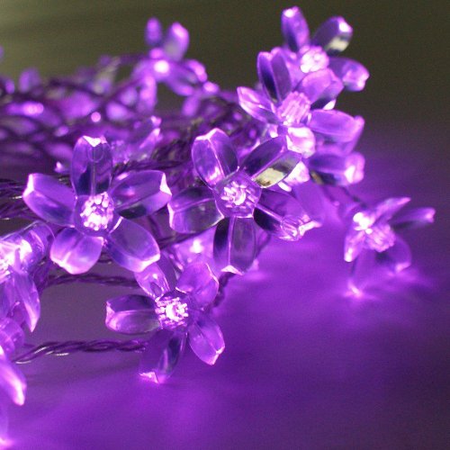 These high quality solar string lights feature 50 superbright Purple LED's each fitted with a transparent blossom / flower making them ideal for gardens, homes, weddings, etc. The lights are fully waterproof sealed and create a beautiful effect once they light up..